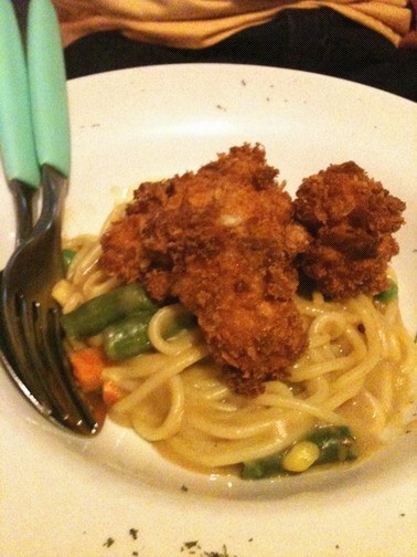 Trus kalo pasta amitabachan pesenan mr jajan, pesan pastanya pake spaghetti, dari namanya aja udah tau donkkk, ala2 indiahe gituhe, pastanya dipakein saus curry, dengan mix vegie, trus dikasi ayam goreng tepung panir yang krispi diatasnya, sausnya cukup creamy.