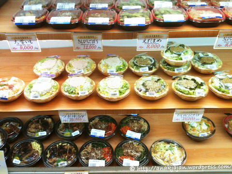 Kemudian ada bagian yang menjual masakan yang sudah diolah dan siap dimakan seperti sushi, katsu, teriyaki, bento-bento, salad, bibimbab, dll.