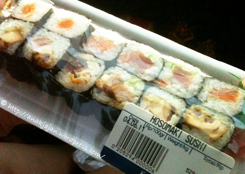 Anak jajan beli sushi yang namanya Hoshomaki Sushi, harganya 15k, isinya ada potongan acar jahe (yang warnanya pink), wasabi, saus sushi, 6 pcs sushi salmon, dan 6 pcs sushi isi ayam teriyaki sepertinya. Sushinya rasanya cukup fresh dan enak. Diantara 12 pcs itu ada 2pcs yang randomly didalamnya udah diisi wasabi T___T, mrs jajan ga suka wasabi, dan sialnya potongan terakhir mrs jajan malah kemakan yang ada wasabi 😦 (untuk sushi supermarket sampai skrg secara rasa masih dimenangkan oleh sushi yang ada di Grand Lucky hehe)