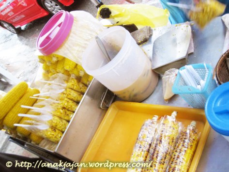Jualannya ada jagung bakar, jagung rebus, mo dimakan utuh, atau dipipil juga bisa. AnakJajan beli yang dibakar and dipipil, harganya lupa berapa, si dede yang beli sih, mrs jajan tinggal malak minta bagian hehe, jagungnya manis and juicy 🙂
