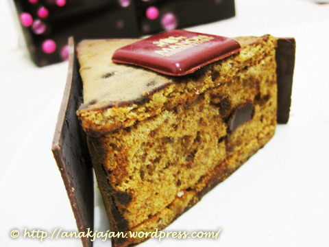 Kue yang berbentuk segitiga itu namanya Toraja Triangle, chocolate sponge cake yang diapit biskuit and dark chocolate diluarnya dengan dark chocolate didalamnya juga.Rasanya lumayan enak, pahit-pahit dark chocolate gitu, tapi rada kemanisan, musti dipaduin ama teh ato kopi biar lebih balance.
