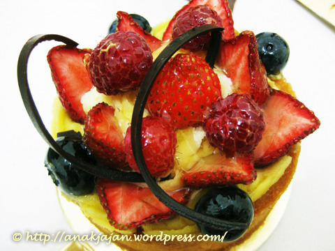 Exotic fruit tart terdiri dari cream filling, topped with mix of exotic fresh fruits served on vanilla crunchy biscuits base. Kulit luarnya rada tebal tapi not soggy at all, masi crunchy waktu dimakan, creamnya rada kemanisan, untung dimakan dengan buah berry yang asam.