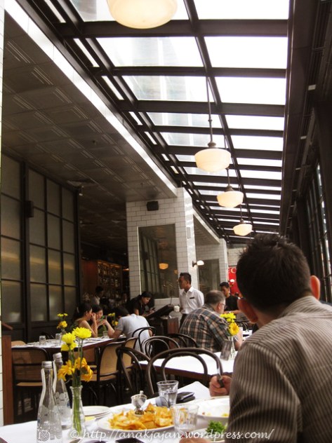 Sampai disana pas jam makan siang, meja-meja terisi penuh hampir 90% sepertinya. Interiornya menarik dari luar tampak seperti rumah kaca dengan jendela yang full menghadap ke fountain di courtyard sana sehingga tempatnya terang, tempatnya cukup cozy tapi agak sempit and dempet antar meja sehingga cukup berisik.