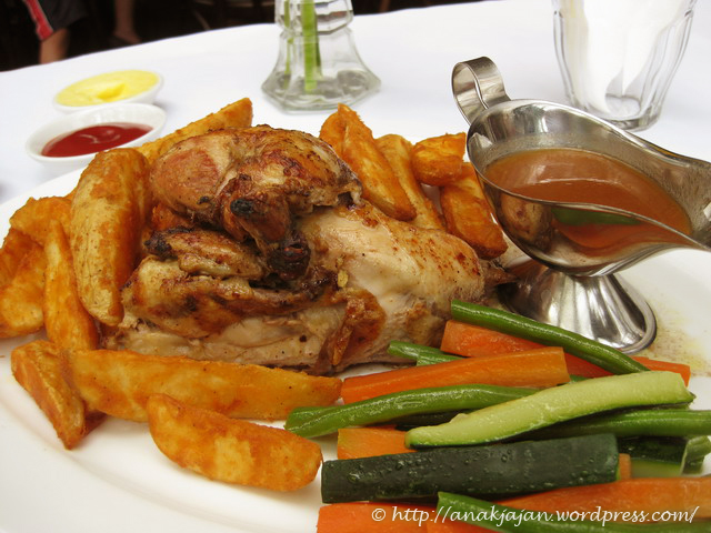 Baby chicken panggang disajikan dengan potato wedges, vegetable, and gravy sauce, untuk menu yang satu ini membutuhkan 25menit.