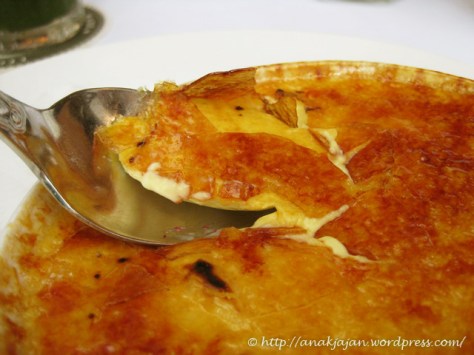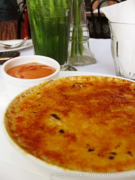 Creme Bruleenya disajikan dengan semangkuk kecil tropical fruit juice yang kental. Juice atau saus creme bruleenya enak, ada aroma mangganya, asem-asem manis.
