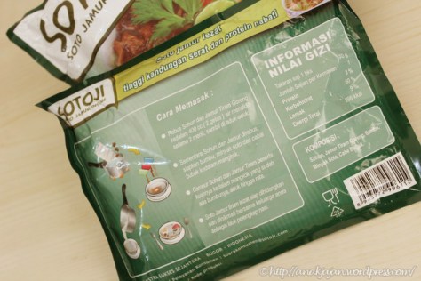 Penampilan kemasan SOTOJI yang didominasi warna hijau sangat eye catching dengan tulisan merk SOTOJI yang besar dan gambar sotonya yang bikin ngiler, kemudian dibalik kemasannya juga disediakan informasi cara memasak yang jelas dan lengkap. Sebungkus SOTOJI (70gr) terdiri dari protein 3%, karbohidrat 60%, dan lemak 9% dengan energi total kalori 296 kkal.