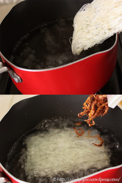 1. Rebus sohun dan jamur tiram goreng dalam 400cc (2gelas) air mendidih selama 2 menit sambil diaduk