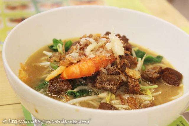 Terdiri dari udang, samcan, daging, titee (potongan kaki babi), mie, kangkung, toge dengan kuah. Mienya tipe mie yang gendut gede dan kuahnya memiliki citarasa yang manis, lebih enak jika ditambahkan jeruk nipis. Si Mr Jajan yang penyuka makanan asam and manis sudah pasti lah suka dengan menu ini. Sekilas rasanya mengingatkan AnakJajan dengan mie udang singapore mimi hanya saja kuah kaldunya berbeda.