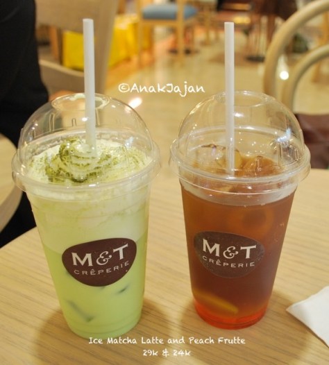 Untuk minuman, kita pilih ice matcha latte dan peach frutte. Ice matcha latte nya sangat light dan whipped cream yang digunakan di minuman ini beneran enak banget, beda dengan whipped cream yang banyak kita temukan di tempat lain. FYI, kita rasa whipped cream ini juga digunakan untuk crepesnya. Minuman kedua adalah Frutte series, jadi selain peach juga ada varian lain seperti lemon. Basically adalah teh dengan campuran sirup khusus sebagai penambah rasa, dan ada potongan buahnya juga loh. Minumannya enak dan nyegerin banget. You have to try it.