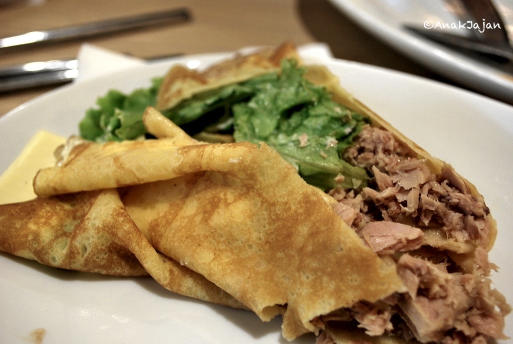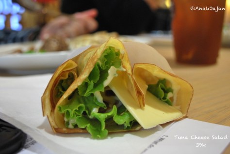Disini kita pesen 2 jenis crepes asin, yaitu Tuna Salad Cheese dan Cheese Egg Rice Roll. Untuk tuna salad cheese adalah crepes yang dibungkus dengan daging tuna, sayur, dan keju. Yang menarik adalah Cheese Egg Rice Roll. Basically kulit yang digunakan adalah kulit crepe, kemudian didalamnya dibungkus dengan nasi berbumbu, telur, saus sambal, dan keju. Favorit kita adalah Cheese Egg Rice roll – the egg is so nice, sementara Tuna salad cheesenya terasa biasa saja.