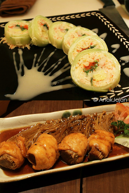 Jamur enoki digulung dengan ikan salmon kemudian digrill dengan saus yang agak manis, jamur enokinya juicy dan krenyes-krenyes ketika dimakan.