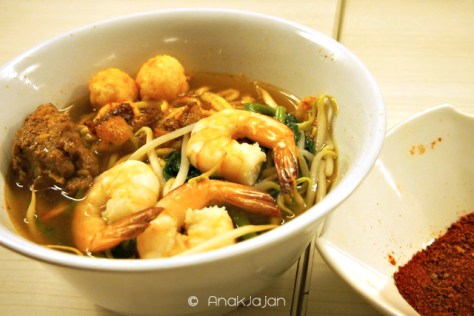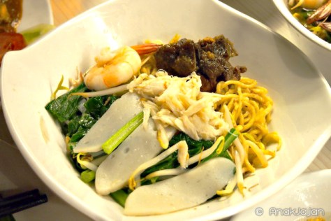Mie ini pesanannya si Mr Jajan, sejenis yamin dengan sayur, fishcake, babi kecap, udang, dan daging kepiting. Agak berbeda dengan gambar di menu yang disajikan dengan capit kepiting, malam itu Mie Kepitingnya disajikan dengan suwiran daging kepiting. Jenis mie yang digunakan adalah mie keriting, agak lebih chewy. Bagi AnakJajan mungkin masih perlu improvement untuk menu yang satu ini.