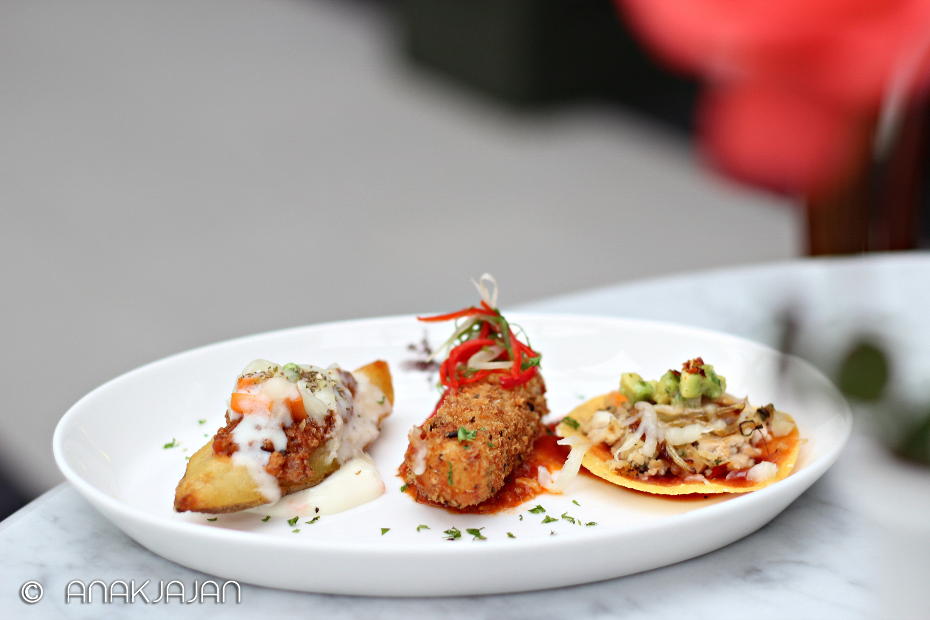 Appetizer dihidangkan dalam bentuk Appetizer Sampler terdiri dari 2pcs x 3 jenis: Deep Fried Mozarella Stick with Marinara Sauce, Gratin Chicken Avocado Taco with Salsa, dan Baked Potato Jacket dimana seporsi appetizer sampler terdiri dari 2 pcs of each (total 6 pcs).