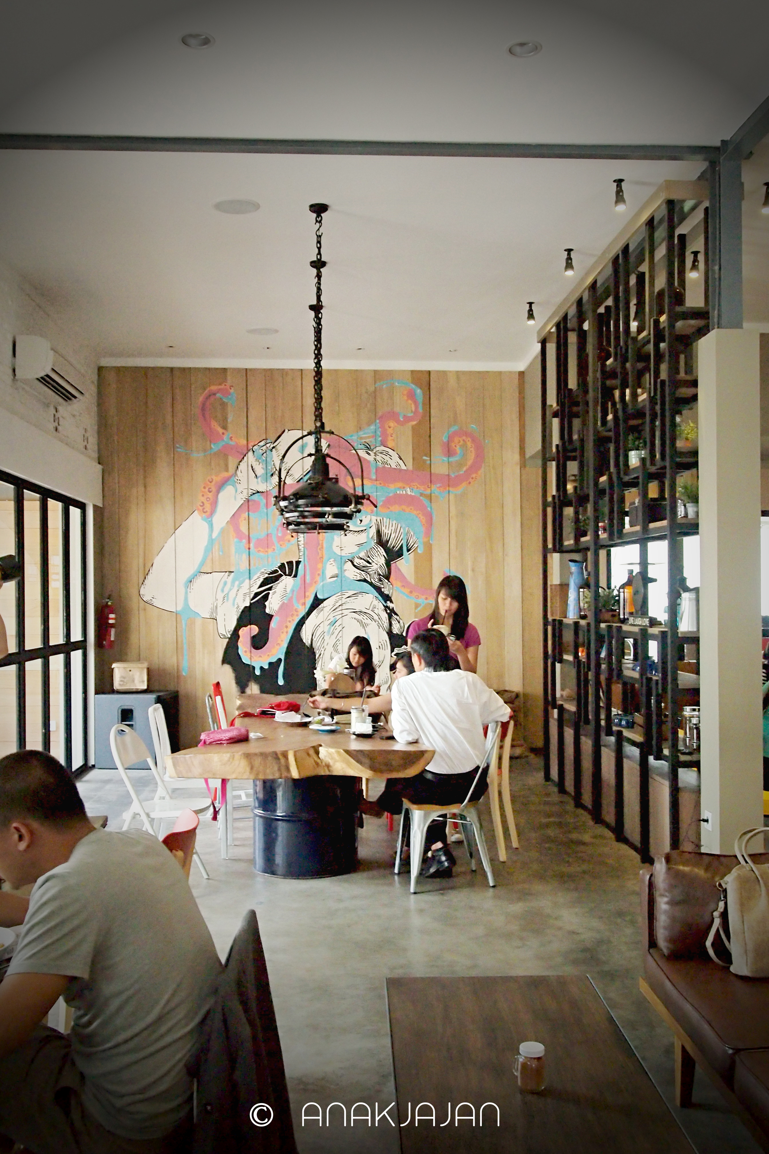 Tempatnya cukup spacious namun agak panas kalau disiang hari karena pintunya depan maupun belakangnya terbuka sehingga lebih terasa AC -> Angin Cendela saja. Interiornya didominasi dengan aneka aksen kayu dan aneka pajangan vintage.