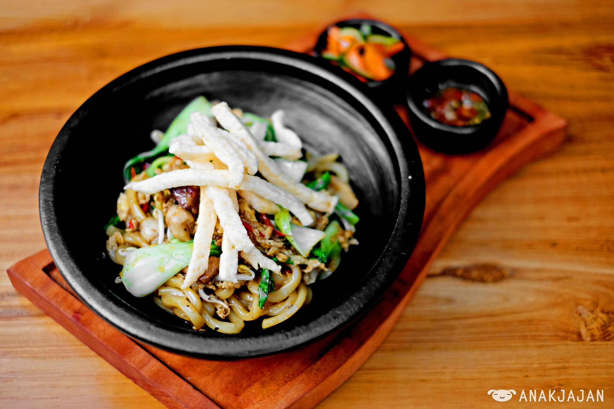 Fried udon with beef, vegetables and Indonesian Java seasoning. It has balance flavor, savory with a bit of sweetness from sweet soy sauce just like usual Javanese fried noodle, topped with crunchy fish cracker. Love it!