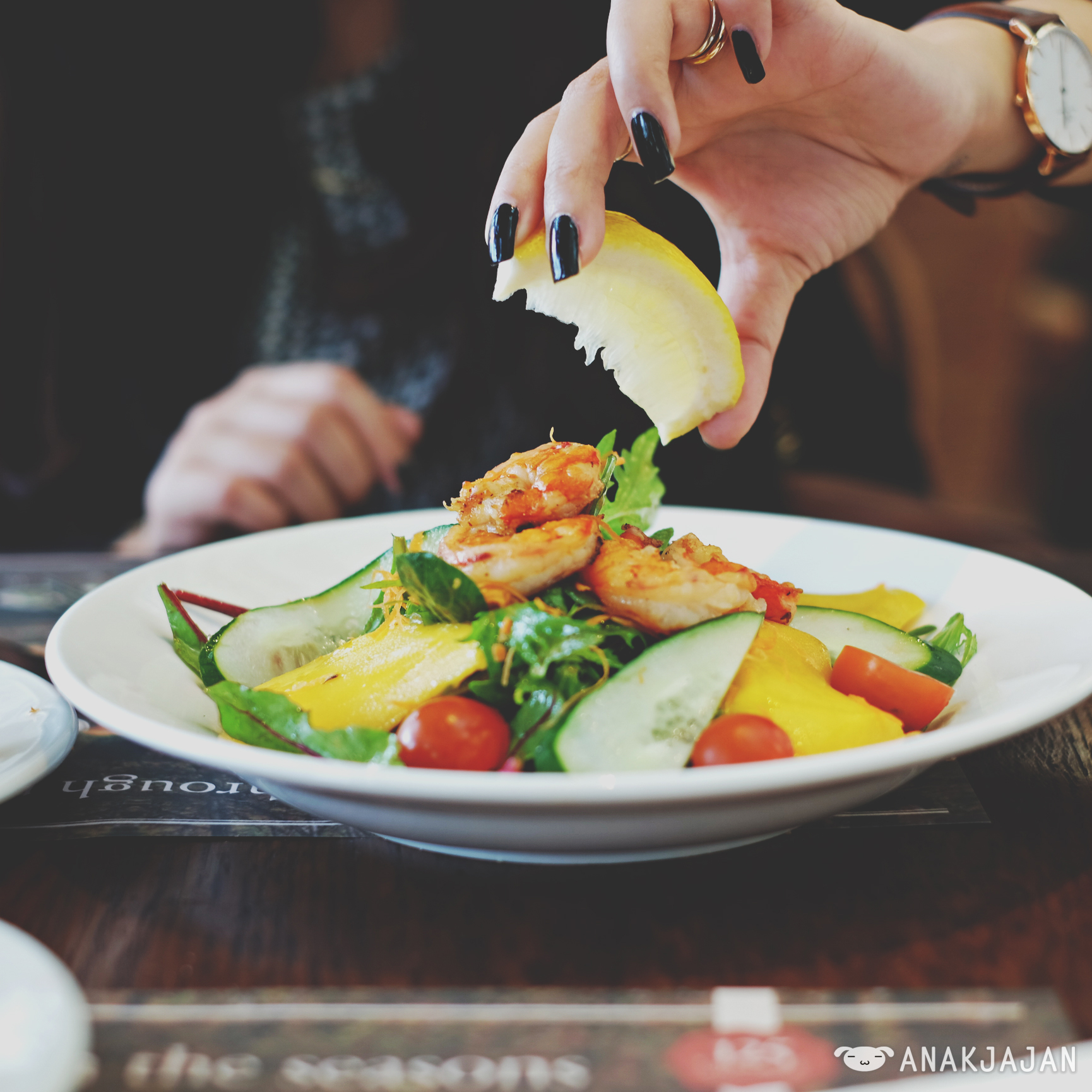 fresh grilled prawns, mixed salad, grated carrots, mango, cucumber and cherry tomatoes
