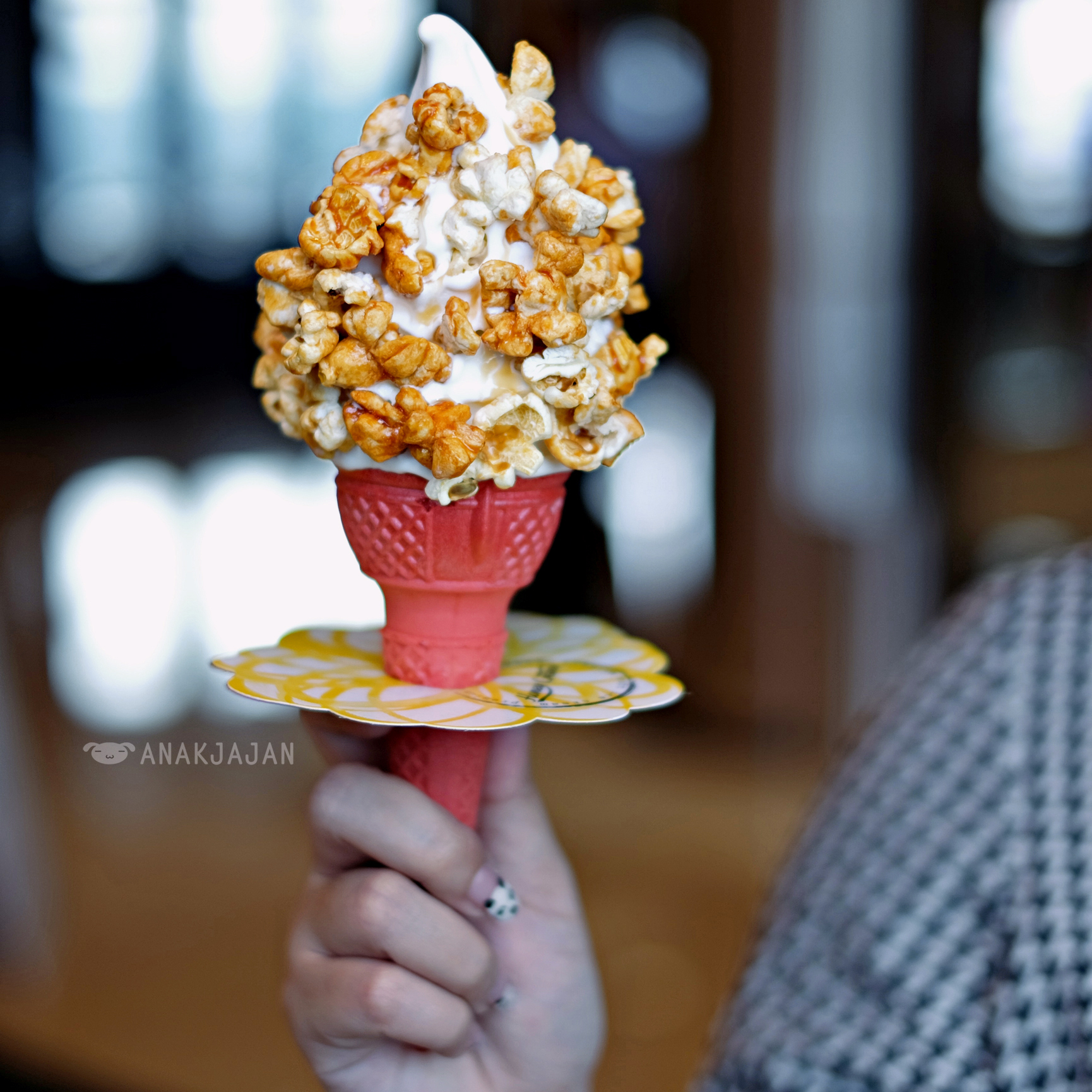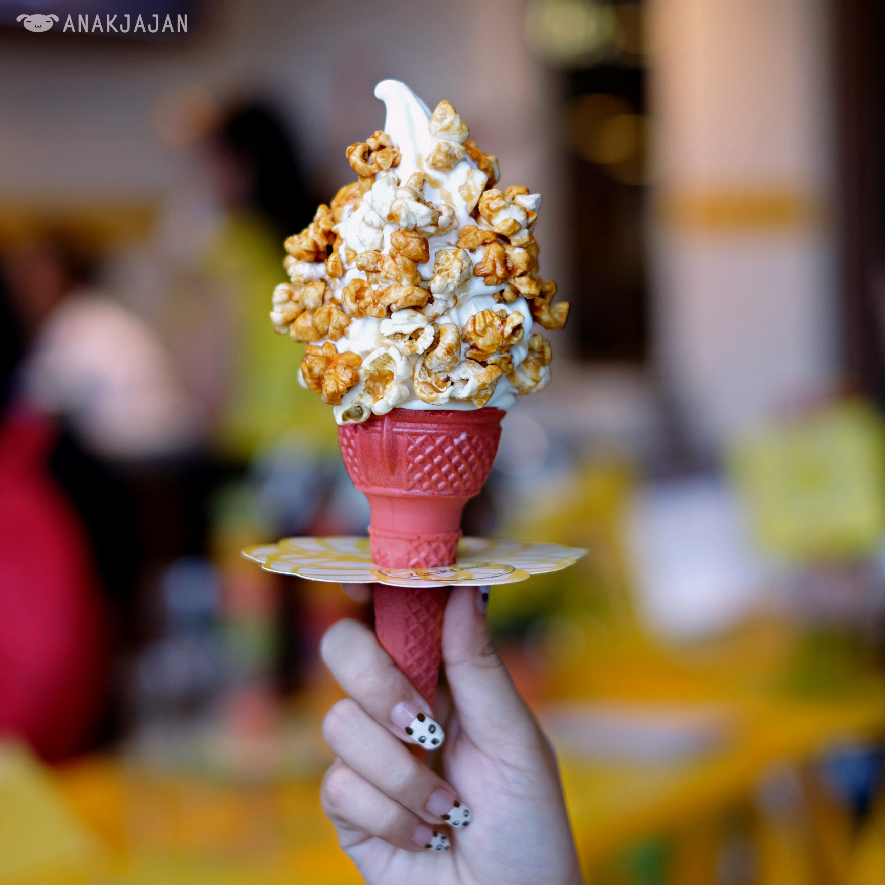 By the way you can have your ice cream served inside plastic cup or on top of their instagenic colorful cone. AnakJajan had our caramel popcorn with red ice cream cone. In terms of texture, AnakJajan personally enjoyed this one more with its crunchy popcorn. Fyi you can also order extra topping such as Honey Comb IDR 10k and Caramel Popcorn IDR 12k.