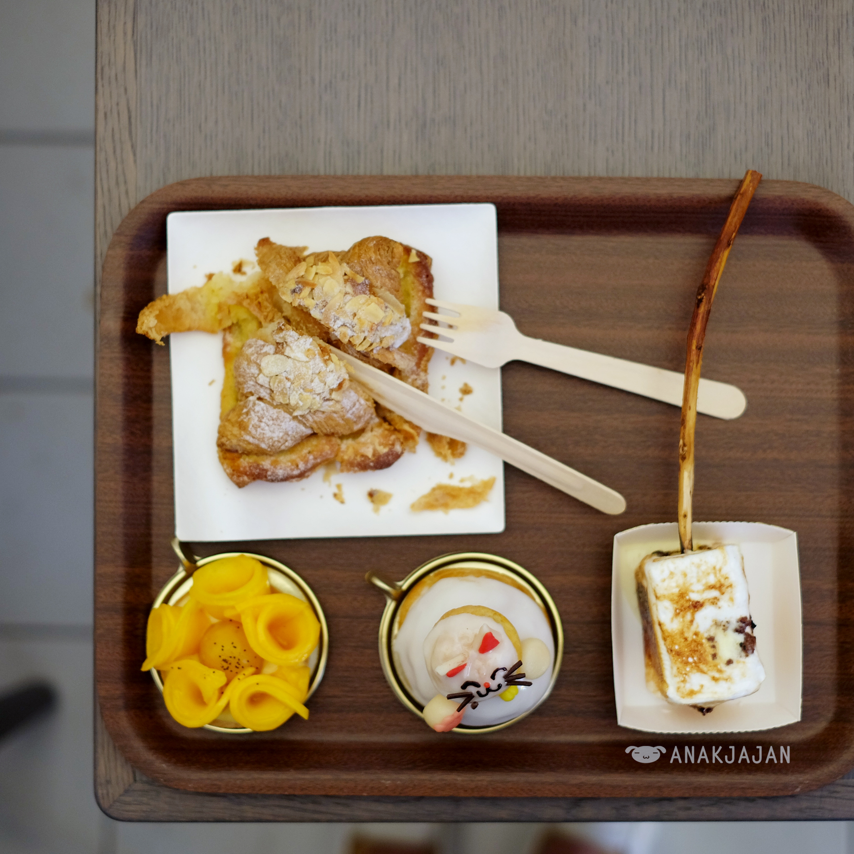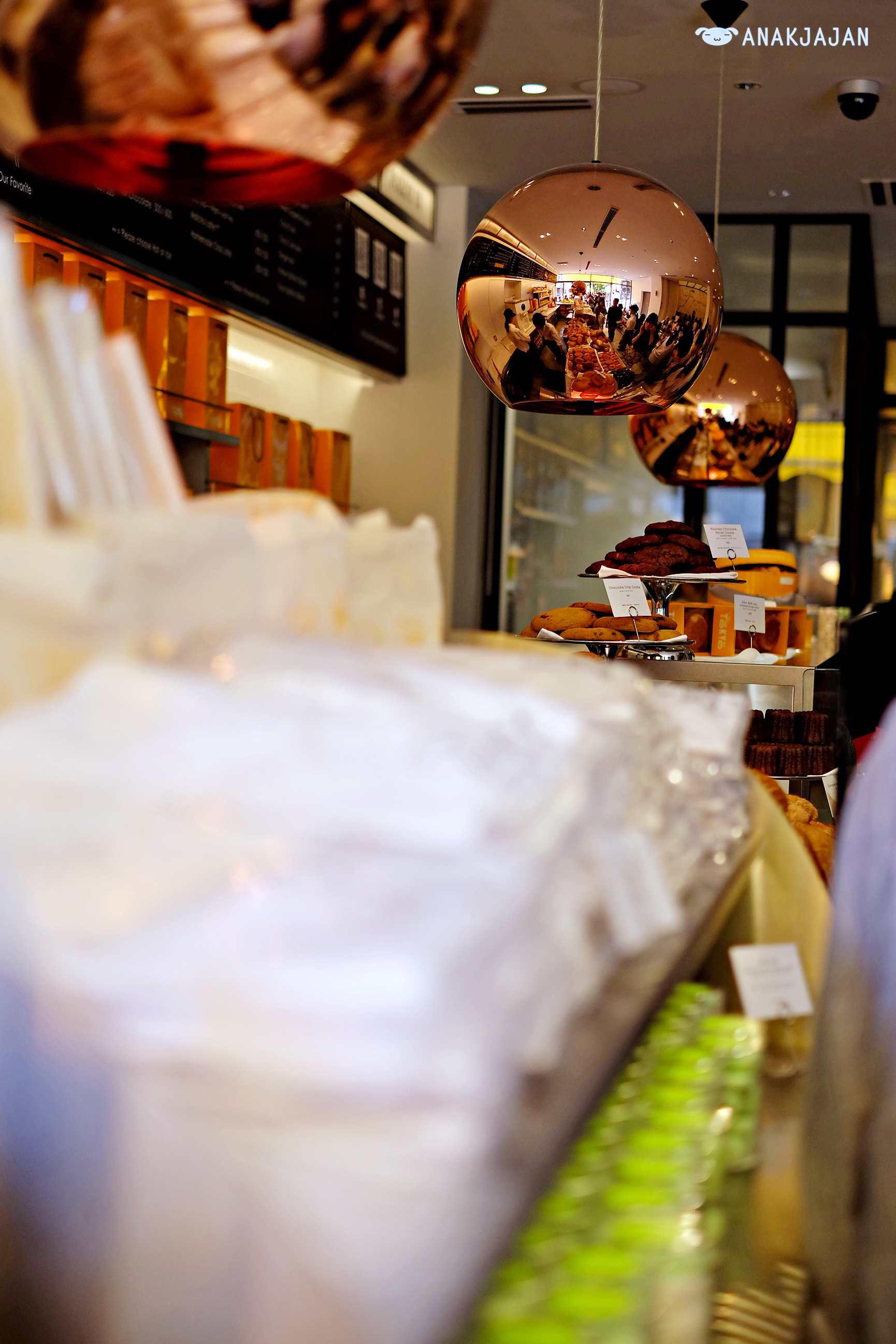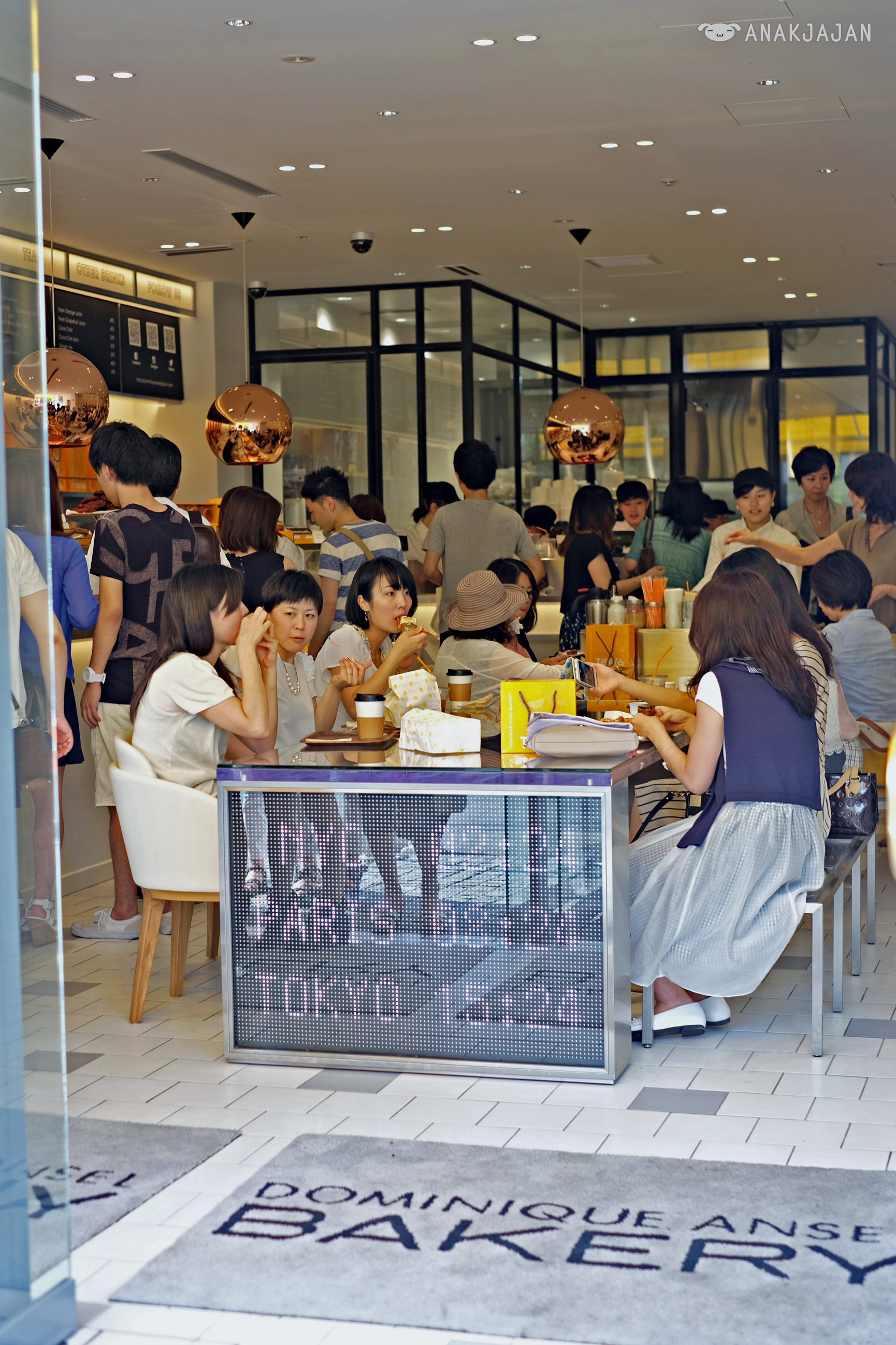 AnakJajan visited Dominique Ansel around 1pm on Saturday, the queue was bearable it took us around 15 minutes to queue unfortunately the famous Cronut 550 JPY was sold out already. If you are dying to try their Cronut, it is advisable to visit the shop early at 8 or 9 am and also they are limiting two cronuts per customer fyi. The famous Cookie Shot 480 JPY, chocolate chip cookie in the shape of shot glass served warm with fresh cold vanilla milk also will only available after 3pm.