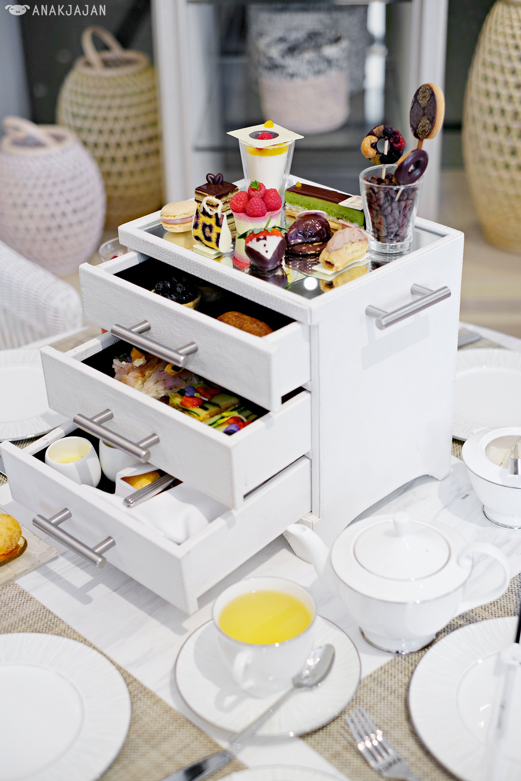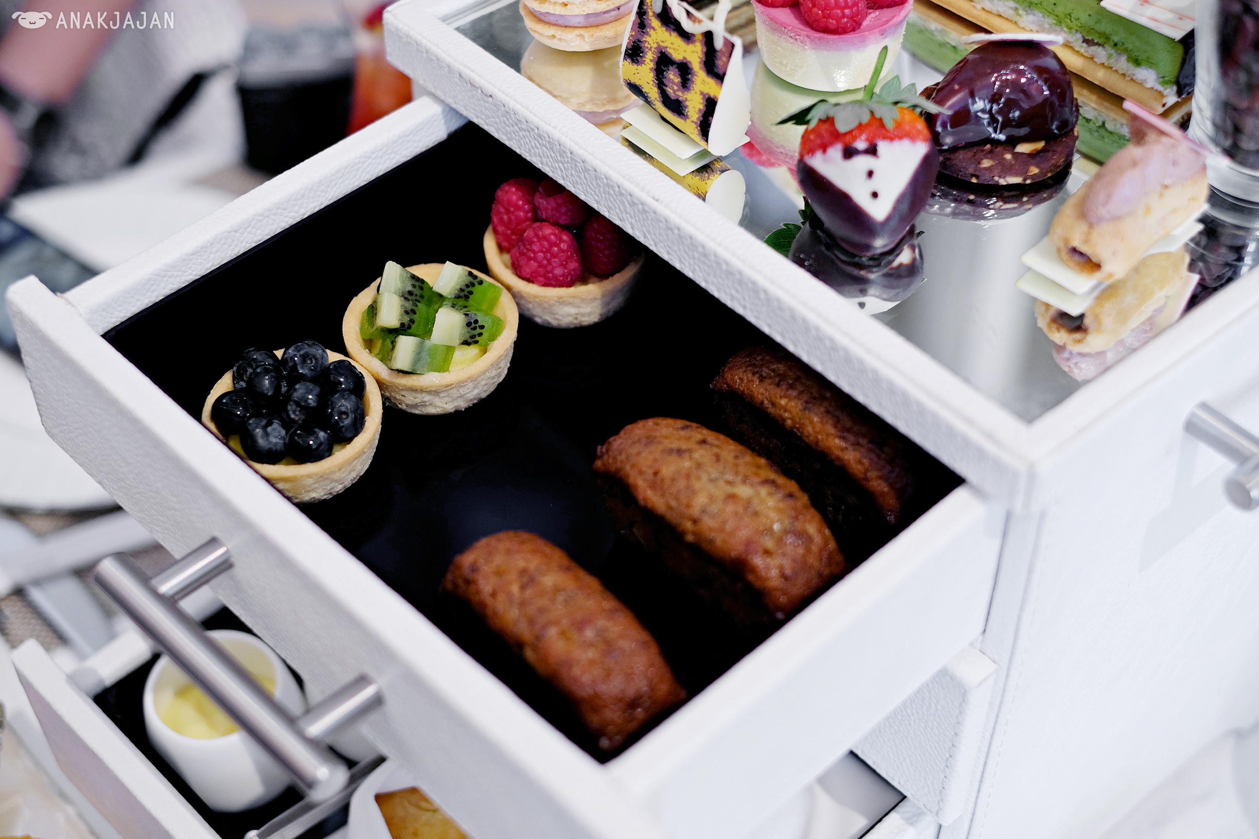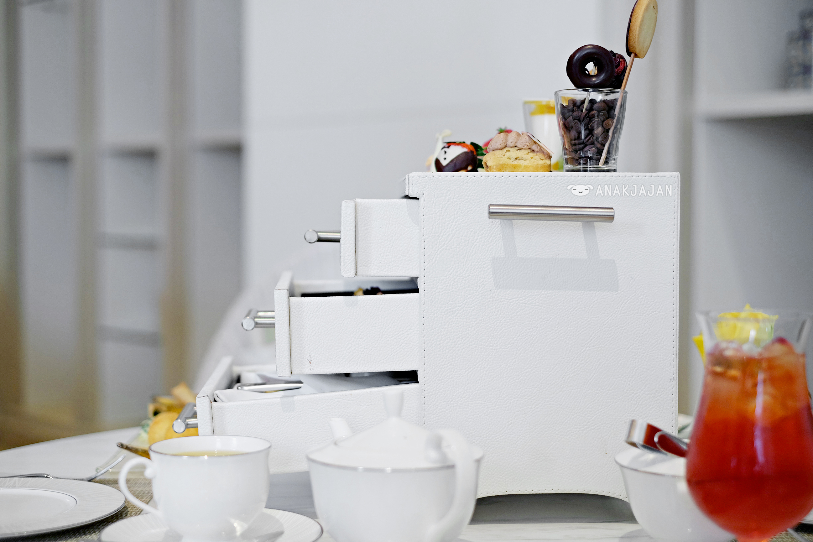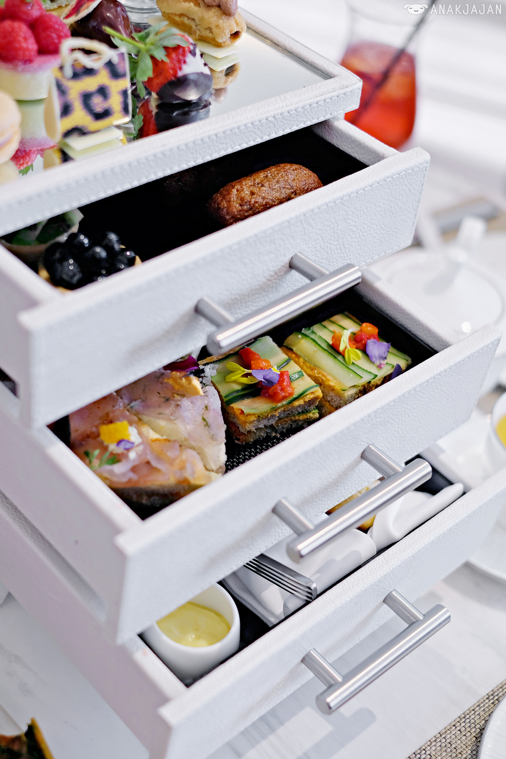 Second reason would be because the afternoon tea itself, their signature afternoon tea is served in a freaking chest of drawers!! But of course if a sophisticated way, pretty white leather chest of drawers.