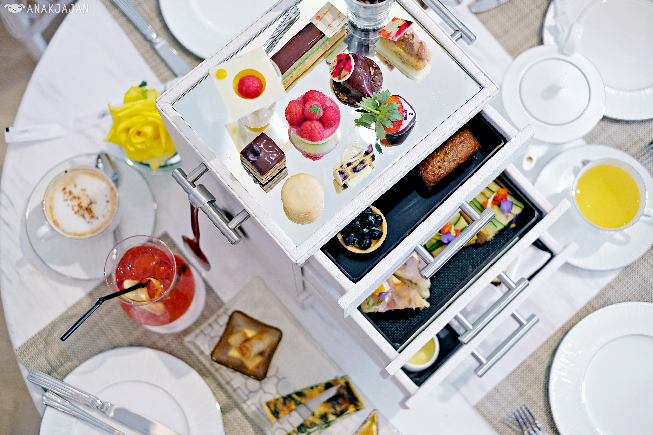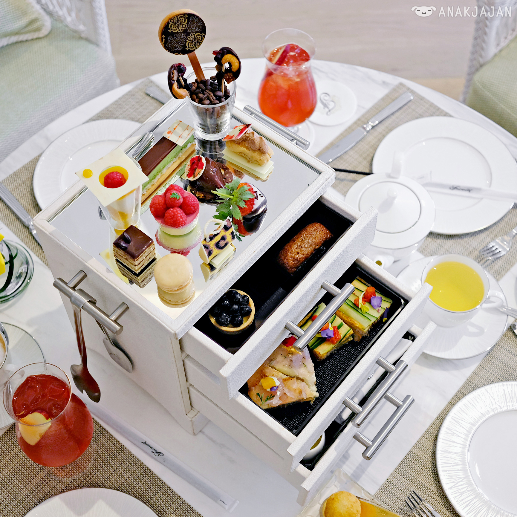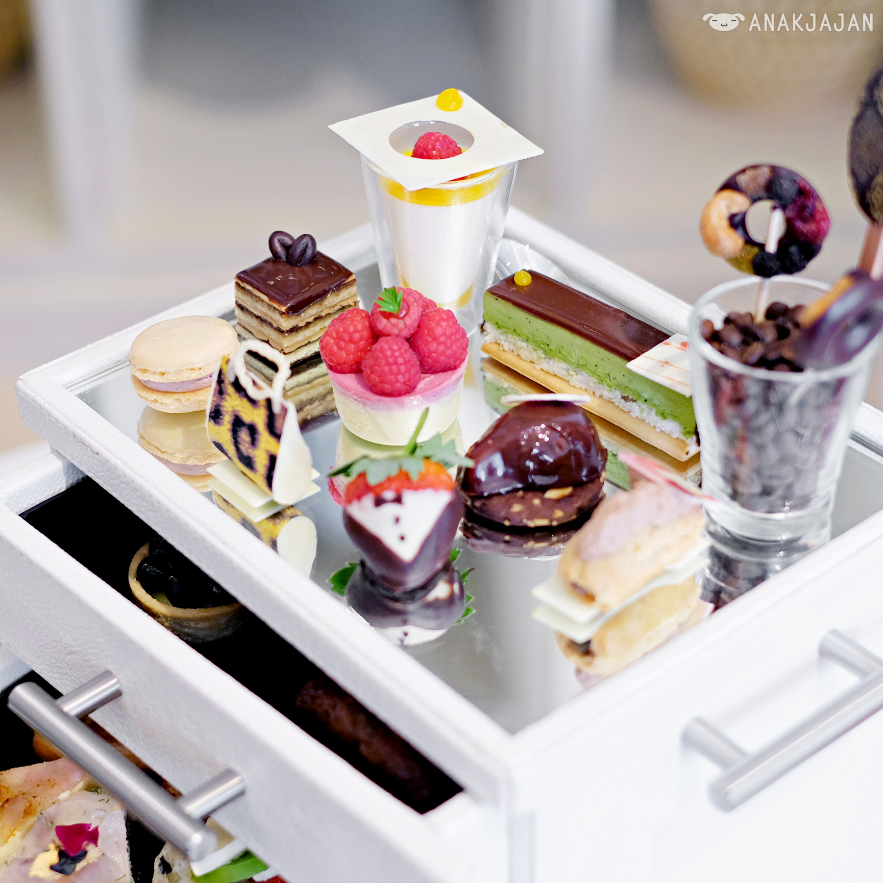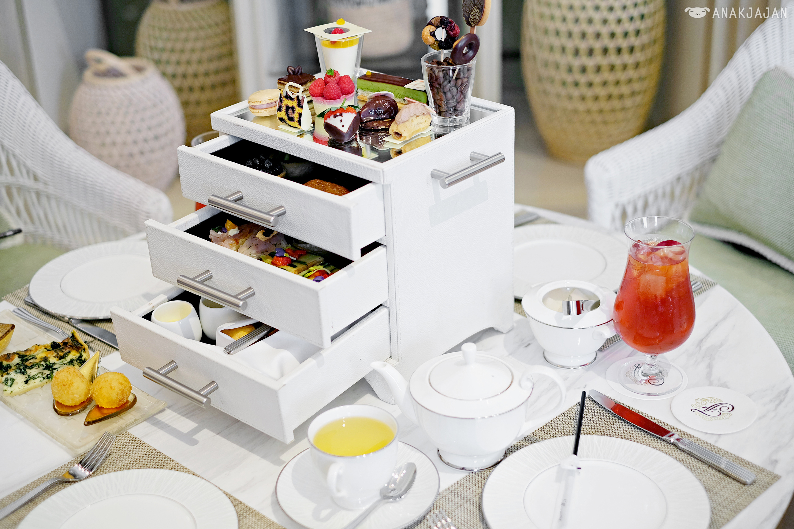 Second reason would be because the afternoon tea itself, their signature afternoon tea is served in a freaking chest of drawers!! But of course if a sophisticated way, pretty white leather chest of drawers.