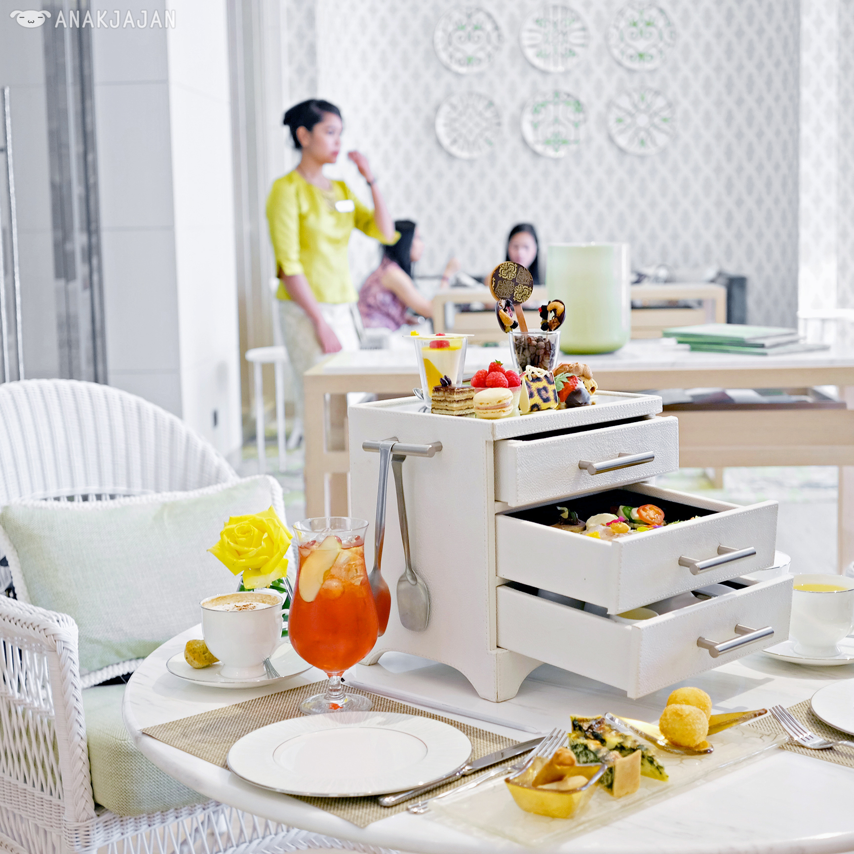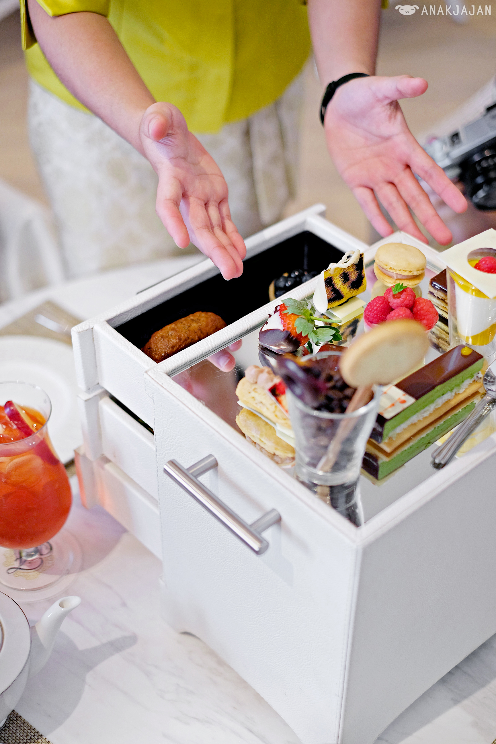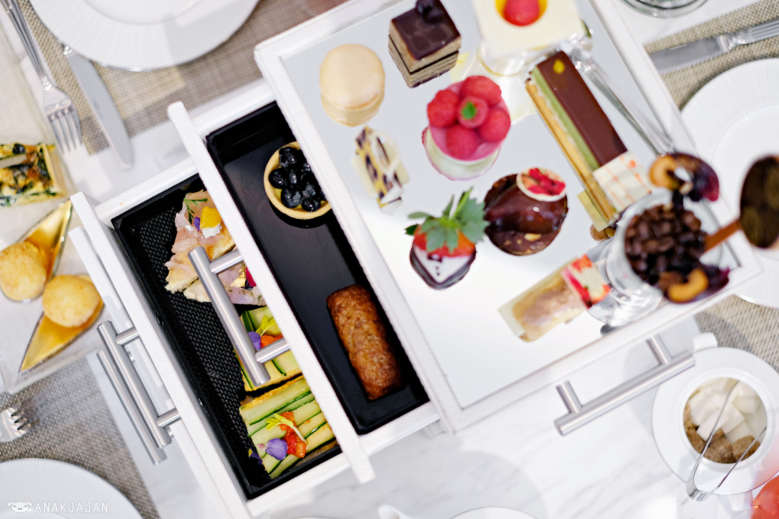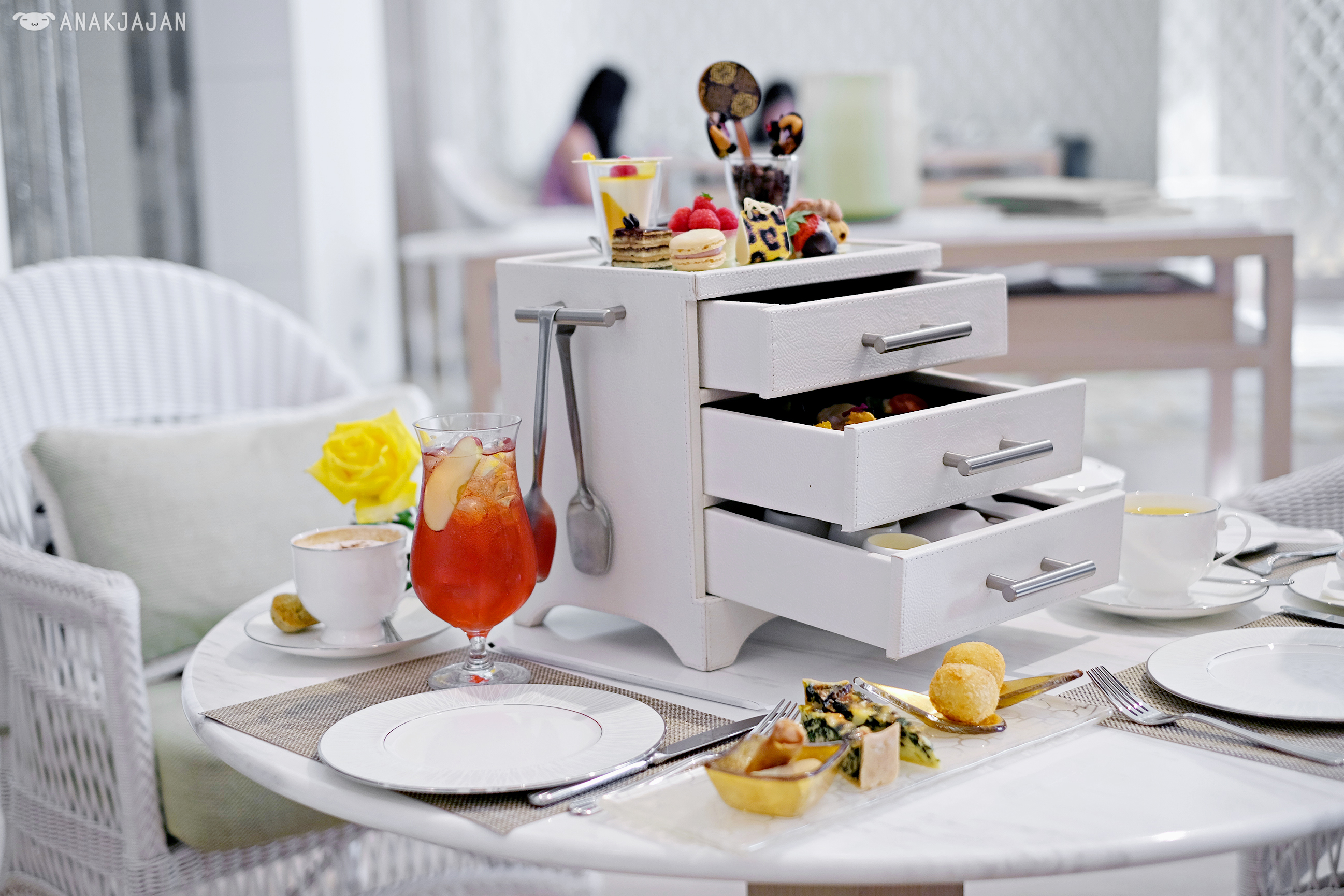 Second reason would be because the afternoon tea itself, their signature afternoon tea is served in a freaking chest of drawers!! But of course if a sophisticated way, pretty white leather chest of drawers.
