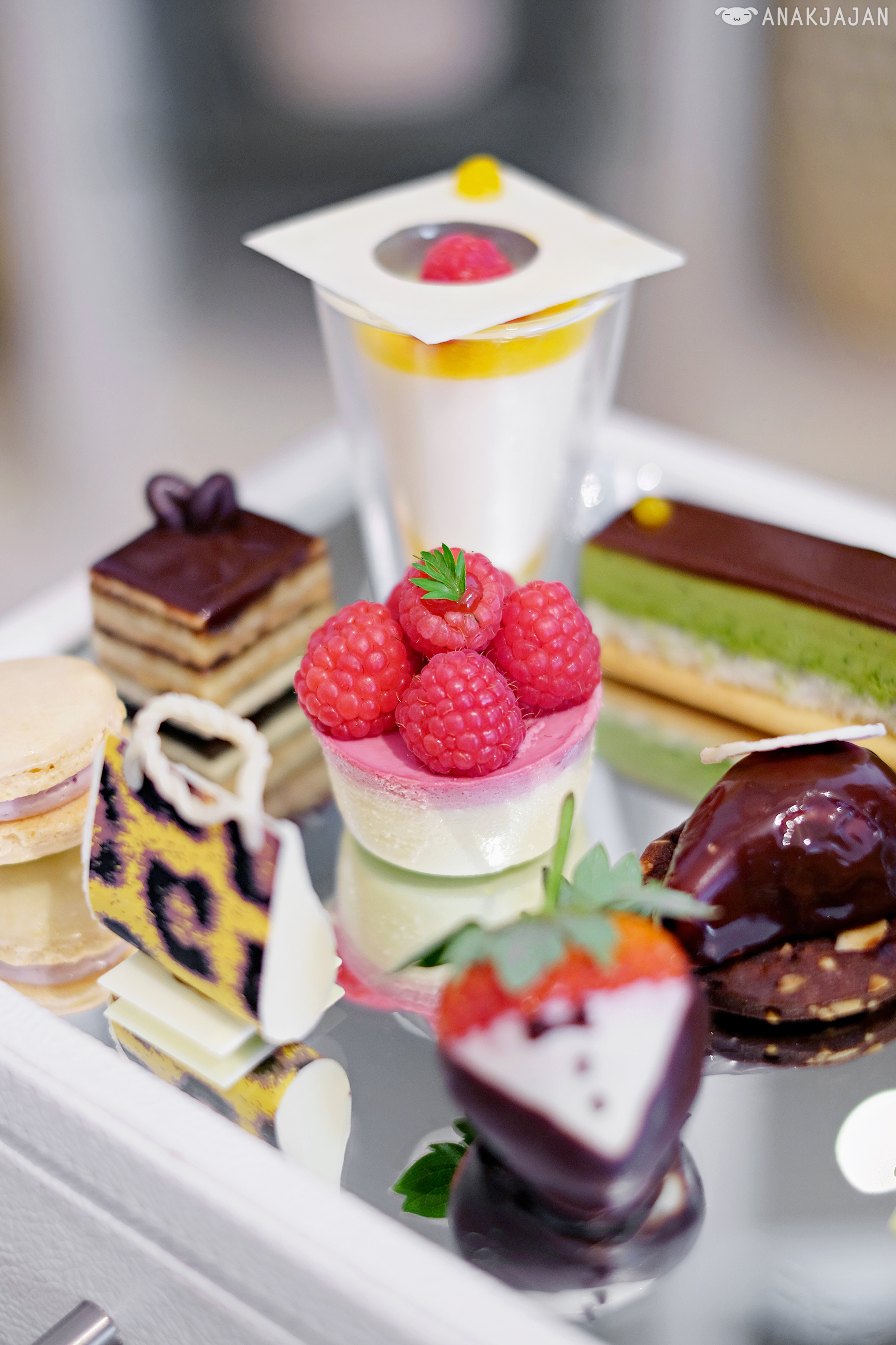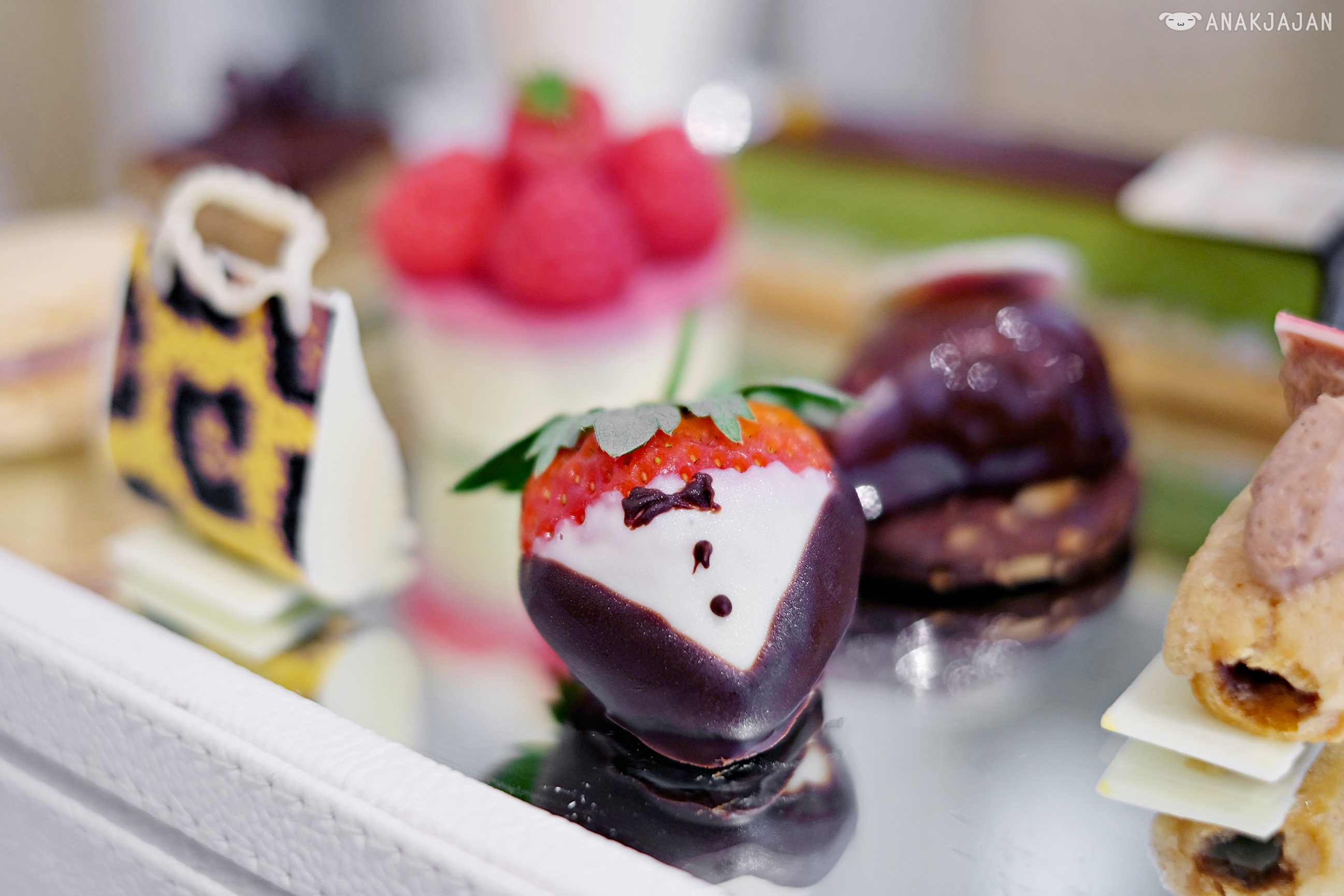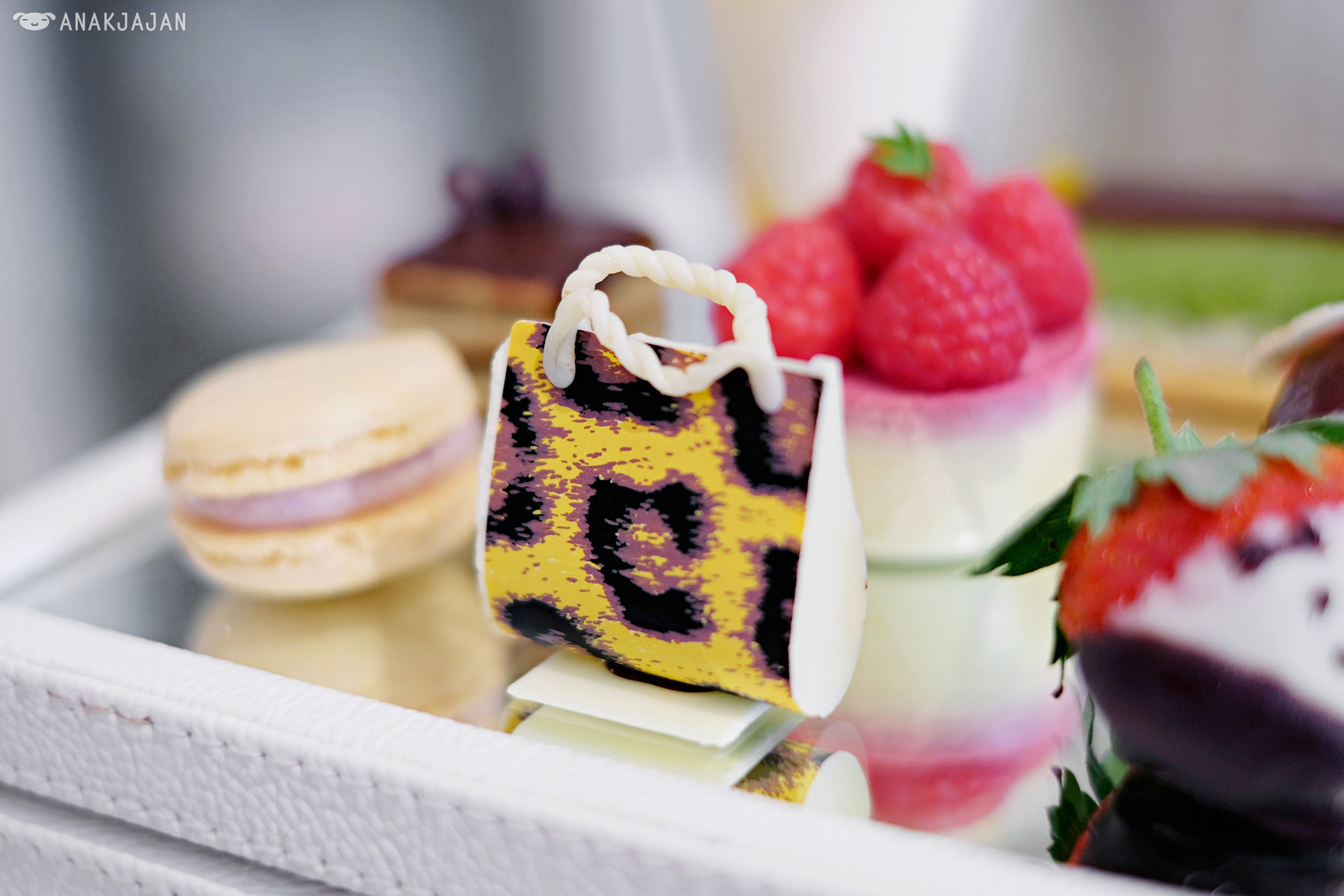 As I’ve said before, the afternoon tea is served in a handcrafted leather jewelry box that looks like a chest of drawers. The petit four were soooo adorable and nicely crafted, just look at the strawberry or bag shaped chocolate, too pretty to be eaten right?!