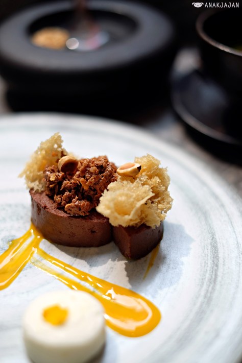 This is a perfect dessert for chocolate lovers, rich dark chocolate with mousse-like texture, yuzu cloud, hazelnut praline. It’s an interesting combo where all ingredients balance and complement each other nicely, you will get the rich bitter sweet taste from chocolate, tangy citrusy taste from yuzu and crunchy texture from praline.