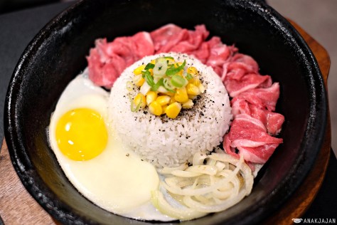 Salmon Pepper Rice includes egg, rice, corn, salmon, onion, and black pepper on top. It’s served on sizzling hot place and the best way to enjoy it is by mixing it all well like fried rice.