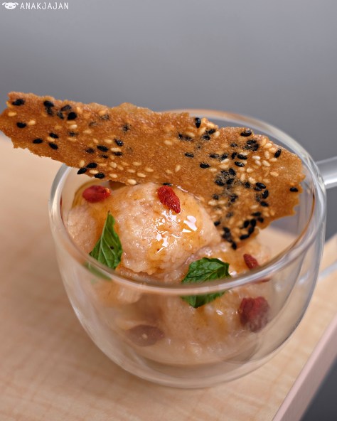 This dessert is indeed very refreshing. It screams lychee in each spoonful. The sorbet is paired with goji berries, jujube honey, sesame tuilles, and fresh mint for extra flavor and texture kick. Sweet, light, fruity, and refreshing!