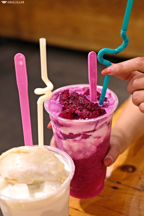 We call this dessert drink, huge durian/ dragon fruit juice with cream and chunks of fruit, it’s such an irresistible guilty pleasure.
