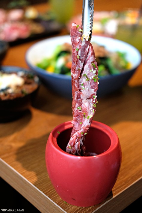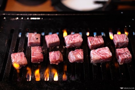 Saving the best for the last, Tokujyo Kalbi or premium A4 Japanese beef shortribs, look at the sexy shiny marbling. It was seriously the best among other cut we had, so sooo tender, juicy, and it literally melts- in the mouth easily. All meat in Waki are lightly seasoned already which plays a major role in making the meat even more delicious. Considering the quality, AnakJajan gotta say that it’s seriously reasonable because for the same quality, it can be twice or triple the price out there.