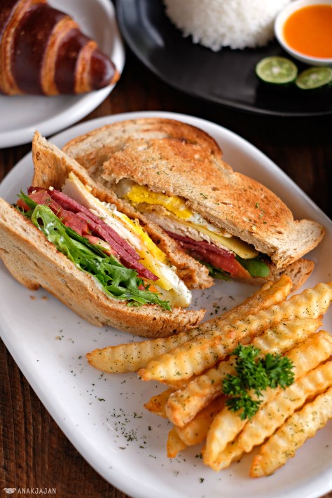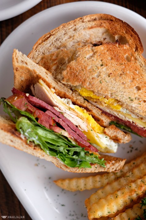 Freshly toasted Grilled Chicken Club Sandwich with multigrain breads, mesclun, egg, smoked beef, slice tomato, grilled chicken, cheese and french fries on the side. It makes an enjoyable companion for a cup of coffee.