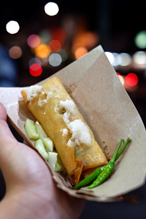 This lumpia stall is located in front of Mutiara Hotel, across Starbucks and it was the best lumpia we have ever had! Consist of chicken, beansprouts, and other vegetables wrapped in lumpia skin, deep fried until golden crispy and served with some kind of shaved garlic, pickled cucumber, and green chili. The shaved garlic, pickles, and chili condiments add sweet, sour and spicy kick which makes the deep fried delicacy well balanced and addicting!