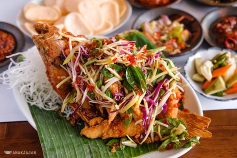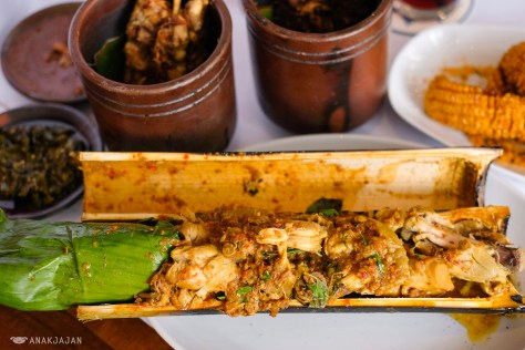 Another dish with unique presentation. Chicken marinated in ginger tumeric, young cassava leaves and red bird’s eye chili cooked in bamboo with charcoal fire. Personally me and Mr. Jajan enjoyed it, the chicken was tender and fully marinated, savory and rich in turmeric flavor, perfect with rice.