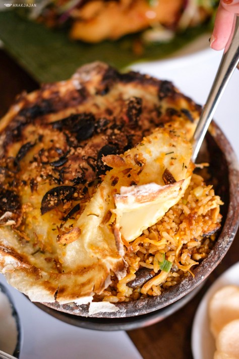 The fried rice with chicken was baked under thin layer of dough. Simply tear the dough above and mix it together to enjoy it.