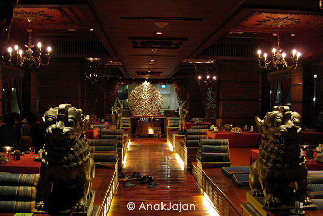Interior restoran ini sangat kental dengan nuansa tradisional thai lengkap dengan lantai kayu dan ukiran serta pajangan khas dengan musik tradisional thai yang slow dan lampu yang temaram menciptakan suasana yang rilex.